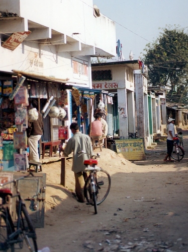 Rajapur bazaar; Tharu women wear multi-coloured skirts; the town water tower is visible on the left