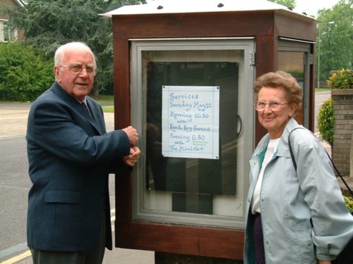 Joe with Peggy tending notices outside Epsom URC 2002; thanks to John Crocker for the photo