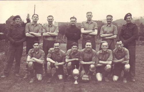 Normany survivors - Irish Guards 1st company football team; Joe has the ball; Xmas 1945