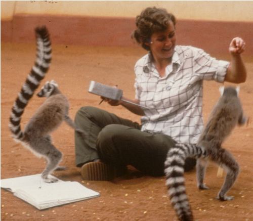 Ring-tailed lemurs of Berenty loved bananas and disturbed Jane writing field notes; photo M E Wilson