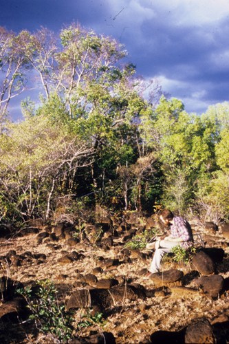 Simon Fowler 'prospecting' on the west side of Ankarana (note basalt boulders) photo by Maggie