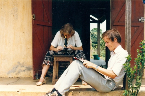 Jane examining a sample under the microscope while Simon records data; photo Anne Denning