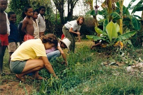 Maggie (foreground), Sally and Jane searching for snails that harbour bilharzia; photo Anne Denning