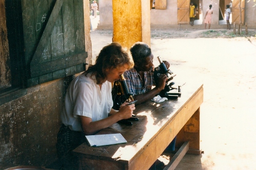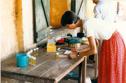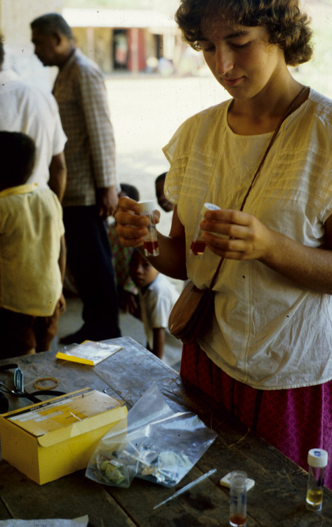 Sally Crook testing urine from school children to find who had bilharzia; photo Anne Denning