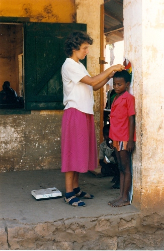 Maggie measuring a schoolboy to check his nutritional status; photo Anne Denning
